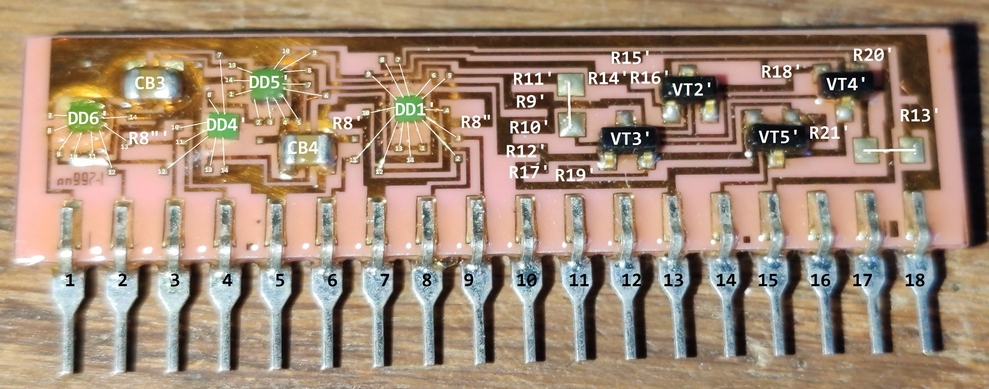 Это позволилило составить схему оригинальной микросборки с расположением элементов внутри микросборки с нумерацией выводов - см. ниже.