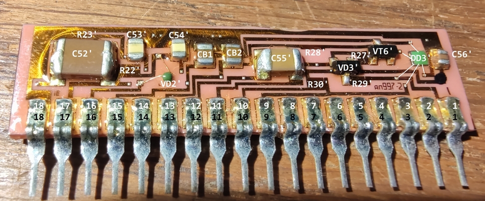 После успешного испытания был проведен рефакторинг схемы с целью уменьшения числа корпусов микросхем. Окончательная и проверенная схема замены микросборки АП997 приведена наже. Обращаем ваше внимание на то, что инвертор DD6'B играет важную роль - используется для создания небольшой задержки, и его исключение (с подключением линии сброса триггеров DD1' напрямую к выводу 5 триггера DD4'A) приводит к неработоспособности схемы.