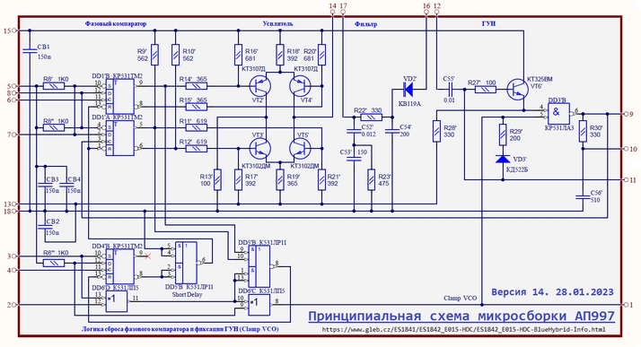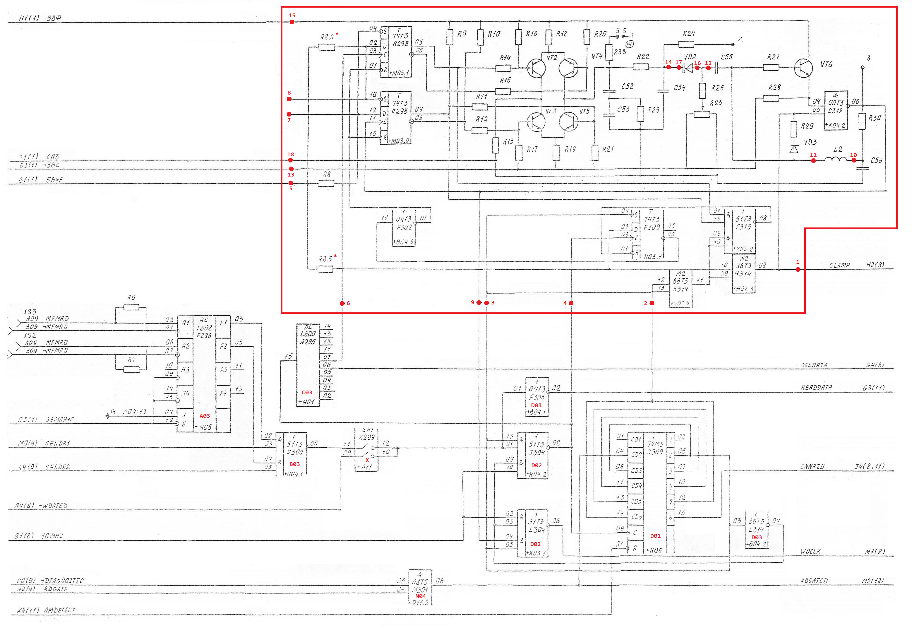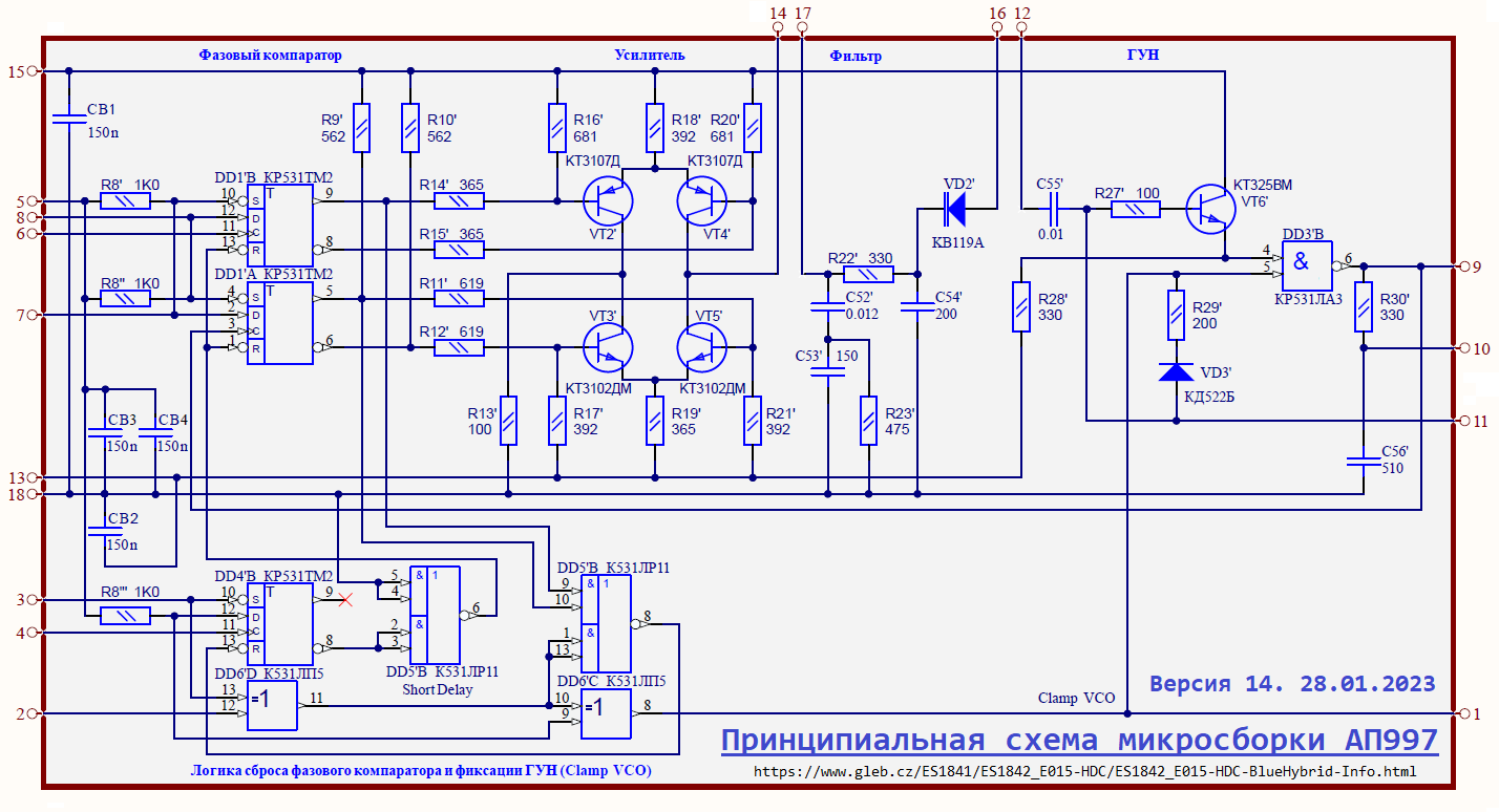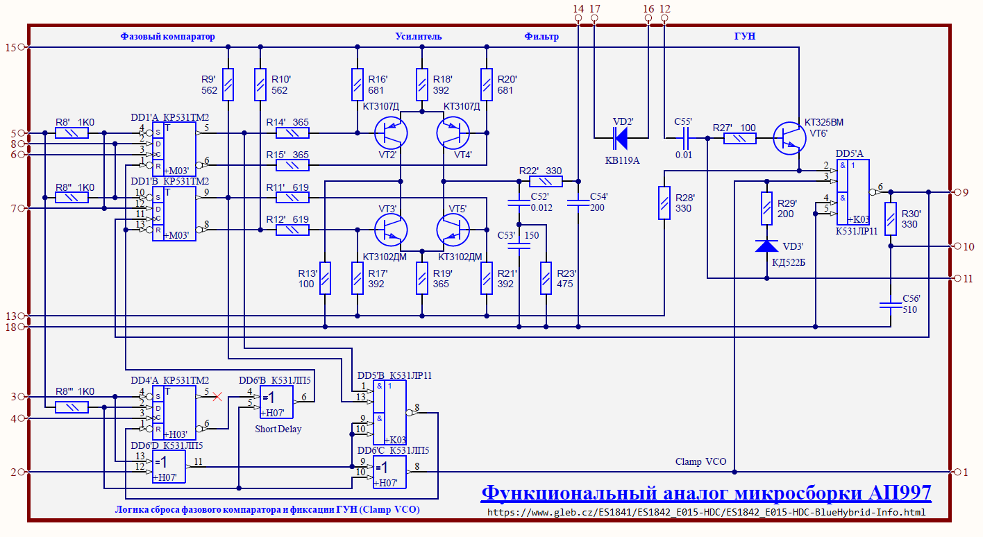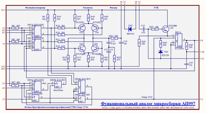 Нам с коллегой удалось успешно заменить неисправную АП997 схемой, собранной на небольшой отдельной плате, после чего работоспособность контроллера восстановилась. За основу нами была взята схема фазового детектора, ГУН и их обвязки, являющаяся частью контроллеров ЕС1841.0004, ЕС1841.0010, ЕС1841.0018. Ниже приведена соответствующая часть схемы контроллера ЕС1841.0010. Красной линией обведены элементы, находящиеся на нашей плате, заменяющей микросборку АП997. Красные обозначения элементов соответствуют позиционным обозначениям аналогичных элементов на плате ЕС1842.Е015.