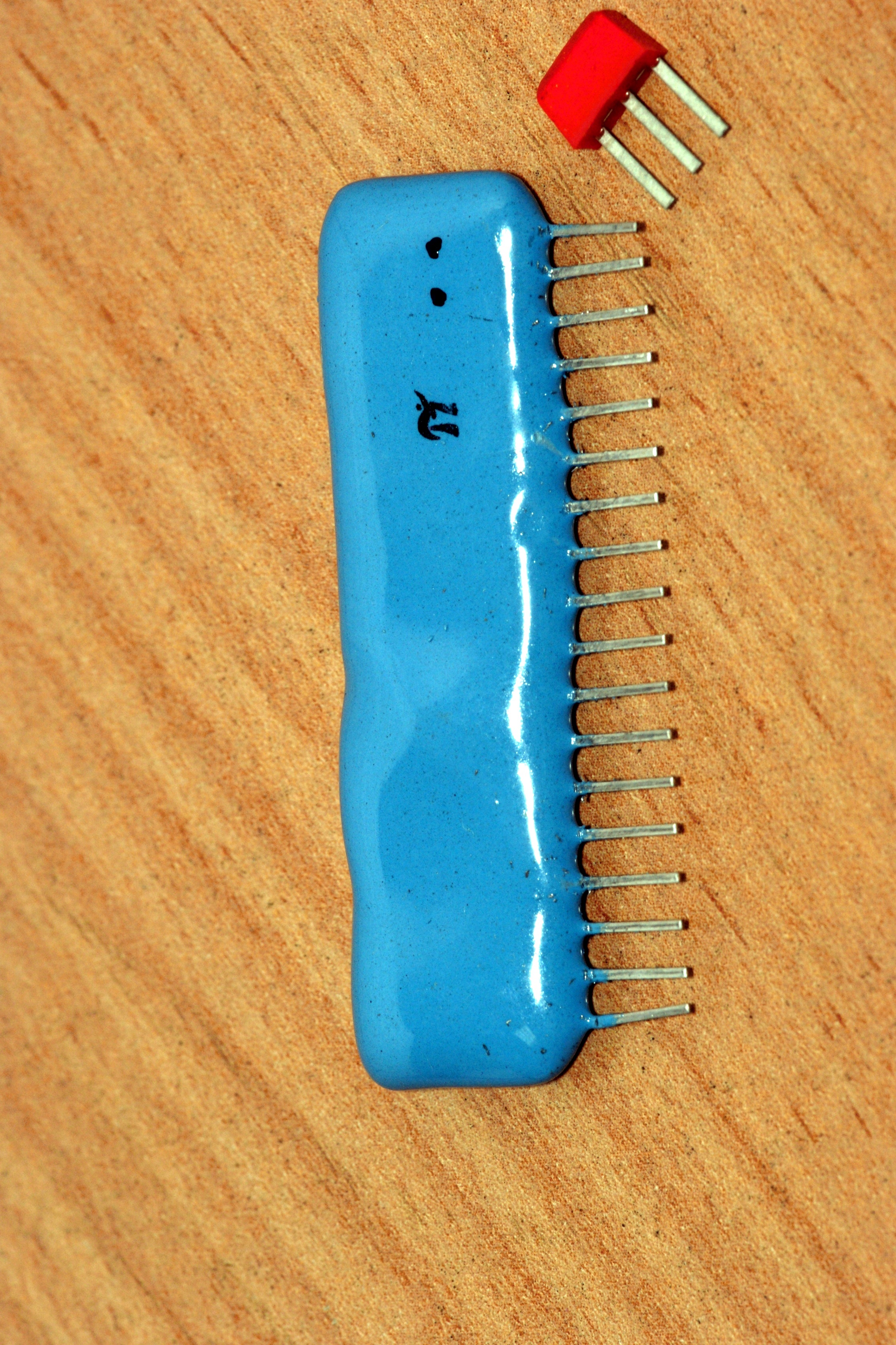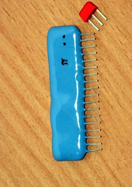 Голубая микросборка АП997 с двумя точками, применявшаяся в некоторых советских контроллерах жестких дисков MFM. Контроллер ЕС1842.Е015